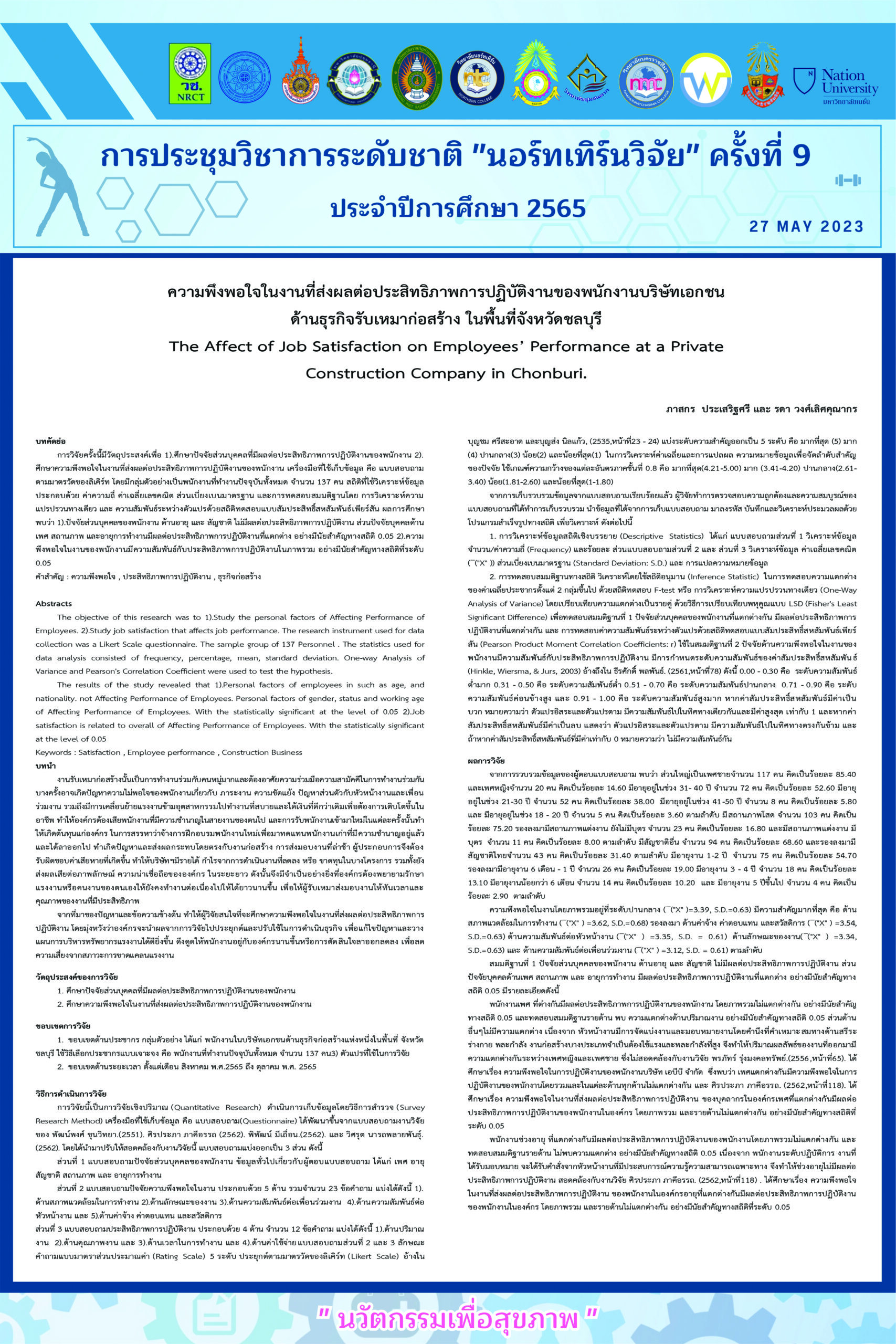 1. ความพึงพอใจในงานที่ส่งผลต่อประสิทธิภาพการปฏิบัติงานของพนักงานบริษัทเอกชนด้านธุรกิจรับเหมาก่อสร้าง ในพื้นที่จังหวัดชลบุรี